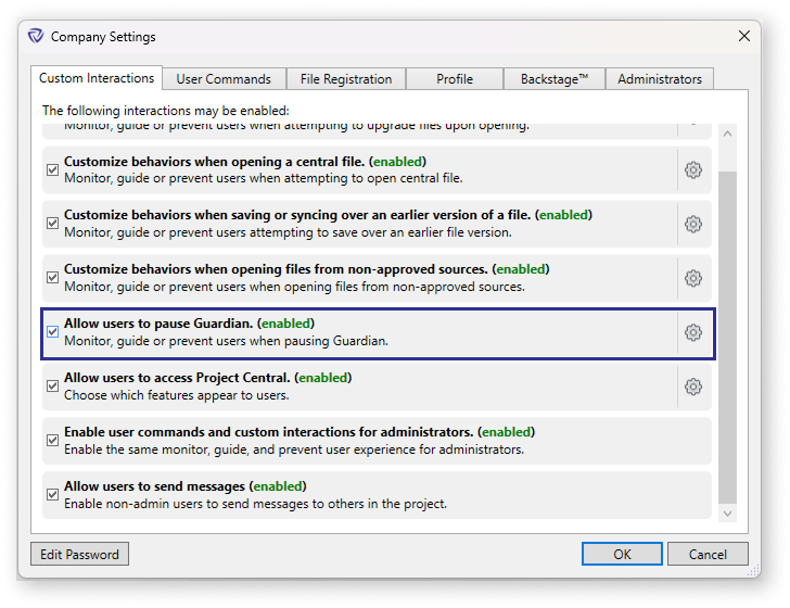Pausing Guardian may be helpful when loading in multiple families at once from a cleaned library. It can be quicker to pause Guardian's scanning and processing function rather than to create a rule in the Approved Content Sources feature. Similarly, while performing a feature demo or training session, it may be better to suspend any Guardian Command Messages.