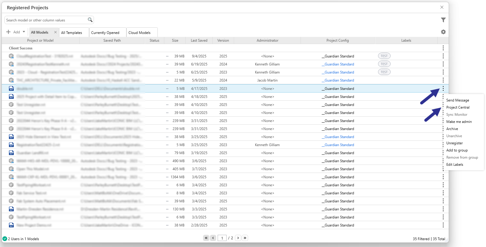 Project Central can be accessed without having the project model open. Under the Registered Projects dialog, simply find the project model in question and select the kebab menu, then select Project Central. Administrators will have access to all the information that Project Central provides as if they were in the active project model.